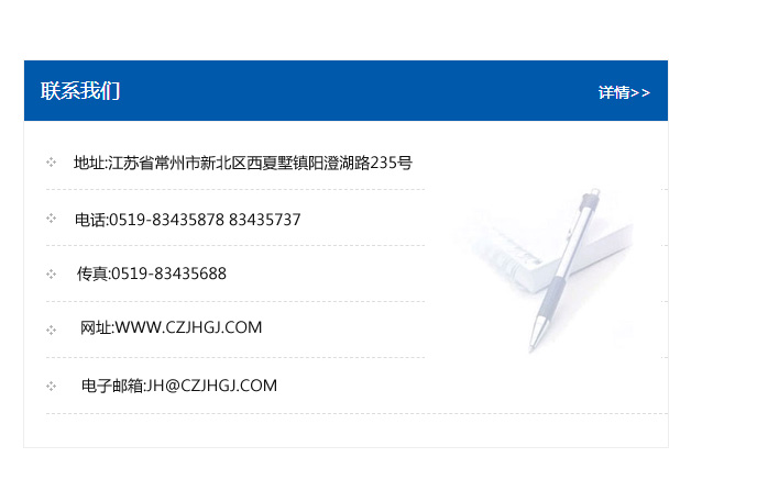 傳真:0519-83435688    郵編:213135    網址:WWW.czjhgj_com.hk-ger.com    電子郵箱:JH@czjhgj_com.hk-ger.com